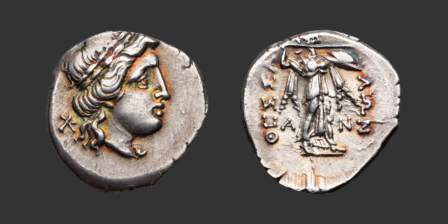 | Revers | ΘΕΣΣΑ ΛΩΝ Athéna Itonia avançant à droite, brandissant une lance et tenant un bouclier, A N dans les champs |