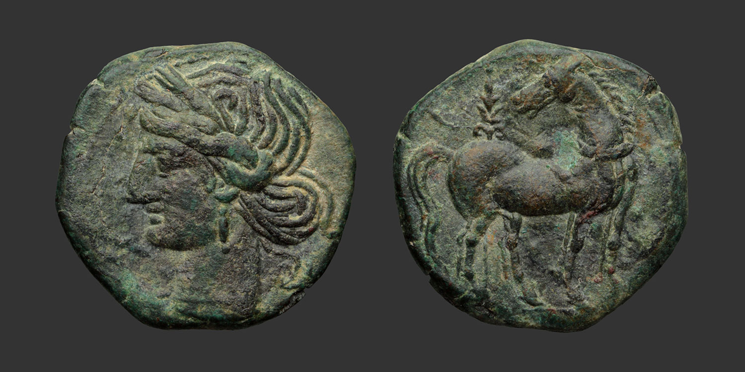 | Obverse | Tête de Tanit à gauche, couronnée d’épis |