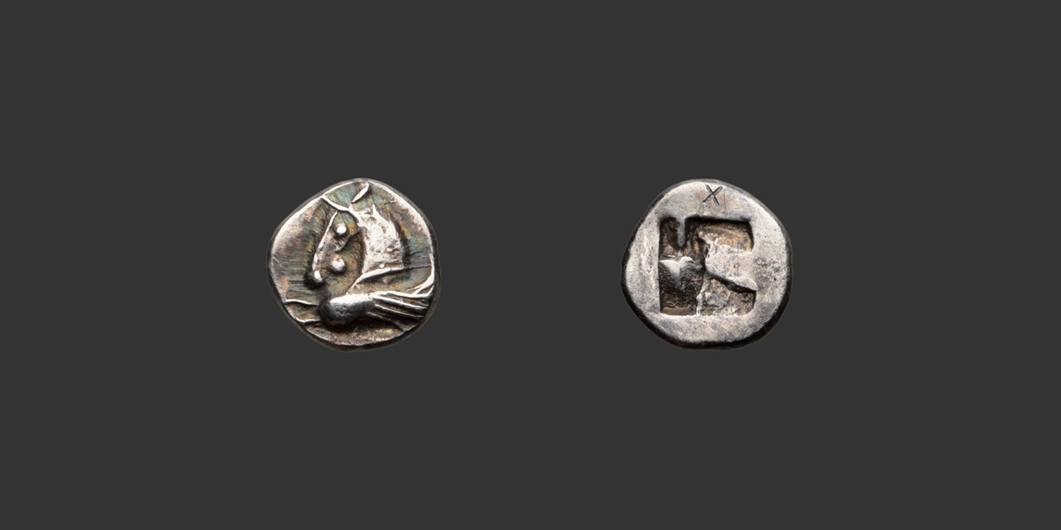 This hemiobol was part of a group of 15 archaic fractions from the Auriol hoard (1865), numbered I to XV and mounted on a gilded silver disk. These 15 coins come from the famous Joseph de Rémusat collection, dispersed on 17-18 May 1900 by the house Rollin & Feuardent, Drouot Paris.