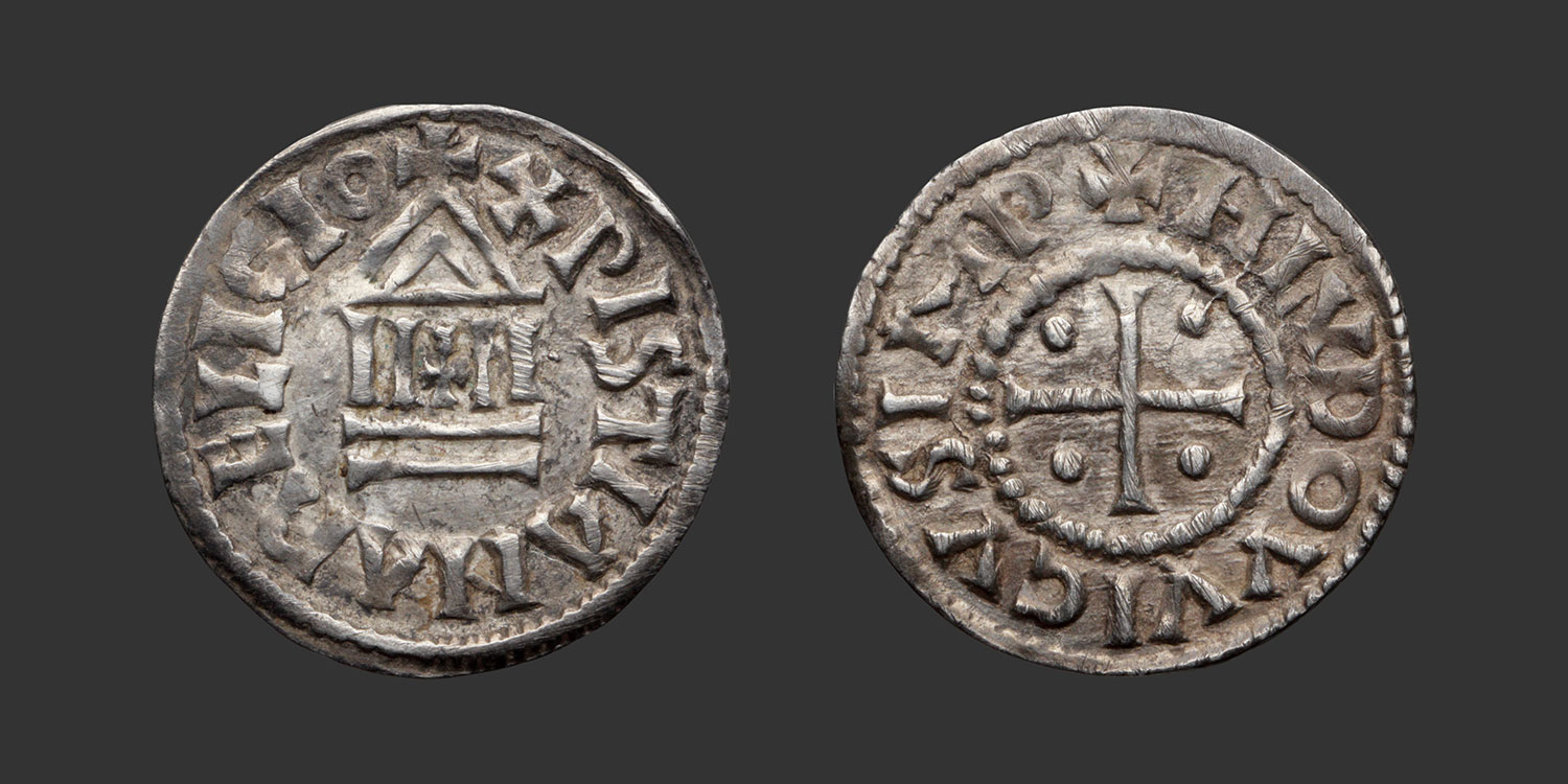 | Reverse | + HLVDOVVICVS IMP Croix cantonnée de quatre besants |