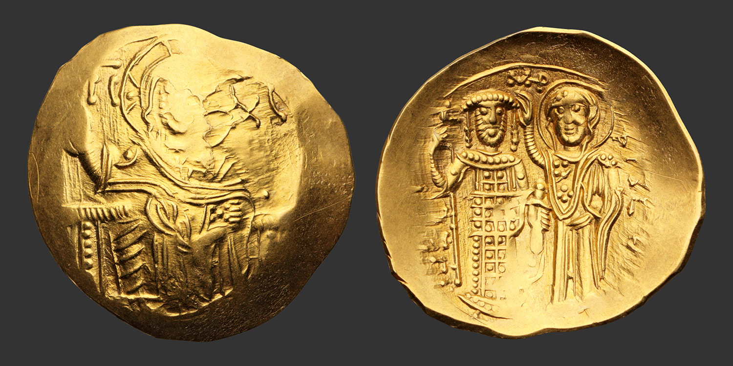 | Obverse | Le Christ Pantocrator trônant de face, levant la main en signe de bénédiction et tenant le livre des Évangiles, IC XC dans les champs |