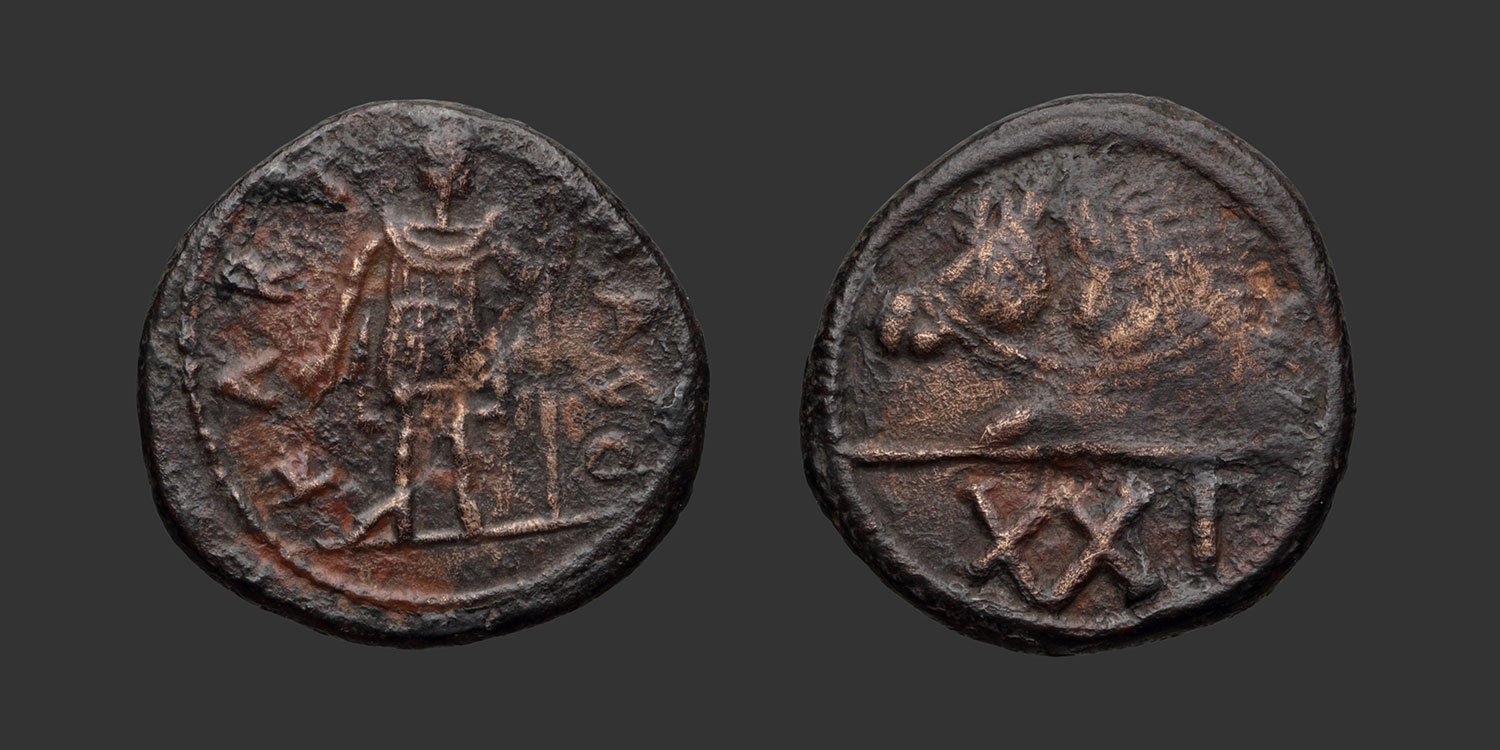 | Reverse | Tête de cheval à gauche, XXI à l’exergue |